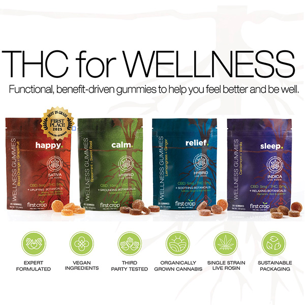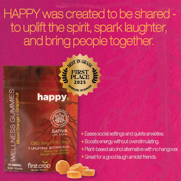 - Our HAPPY gummy recently was awarded First Place in the Best in Grass 2025 – Gummies Category!